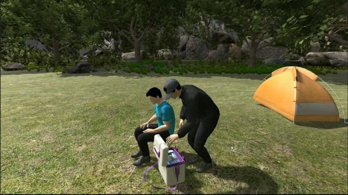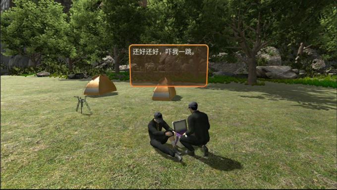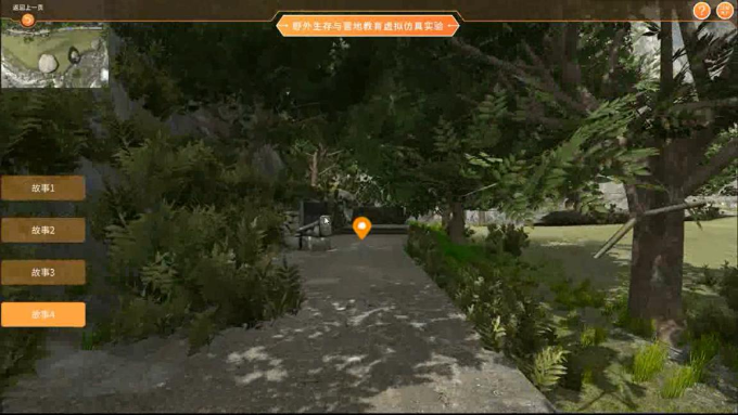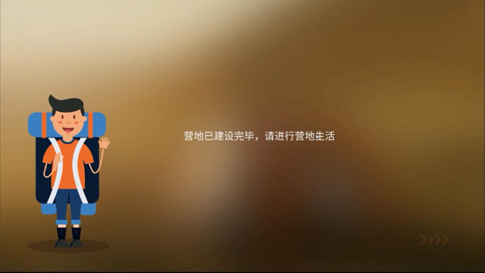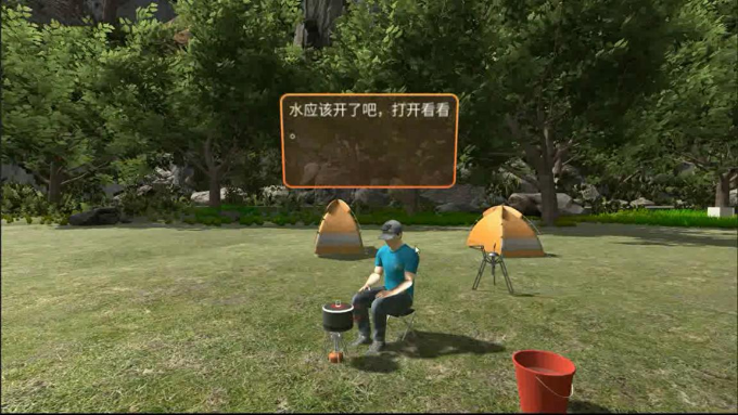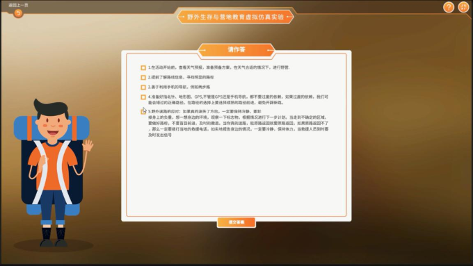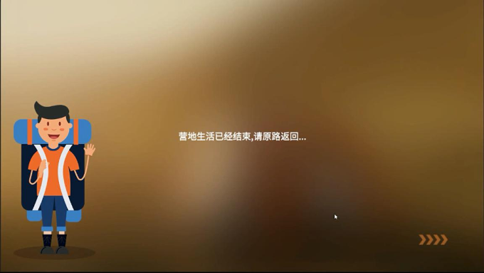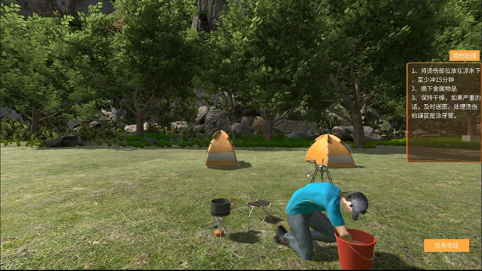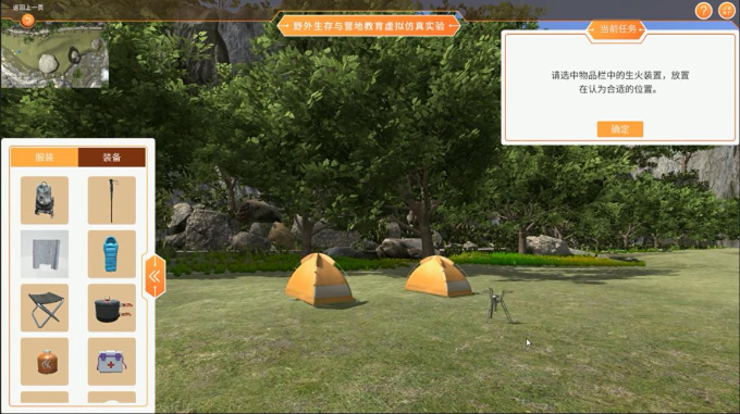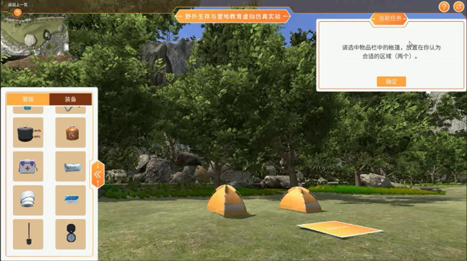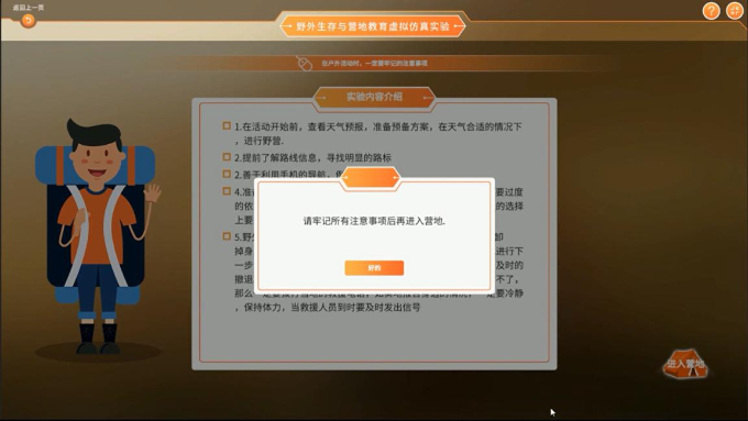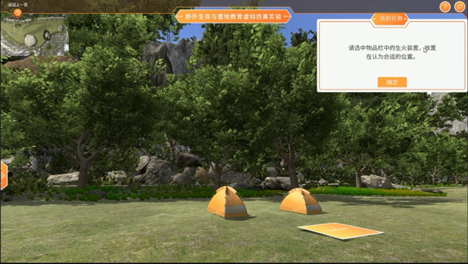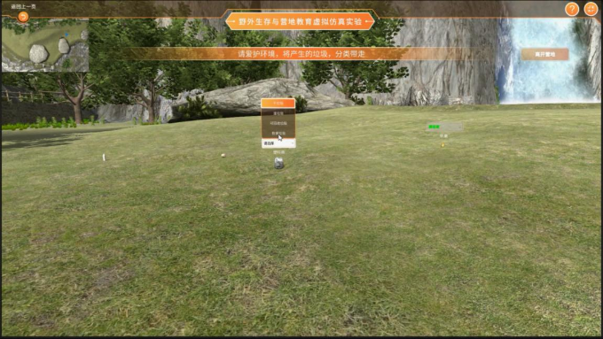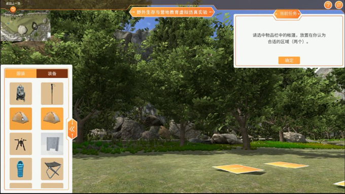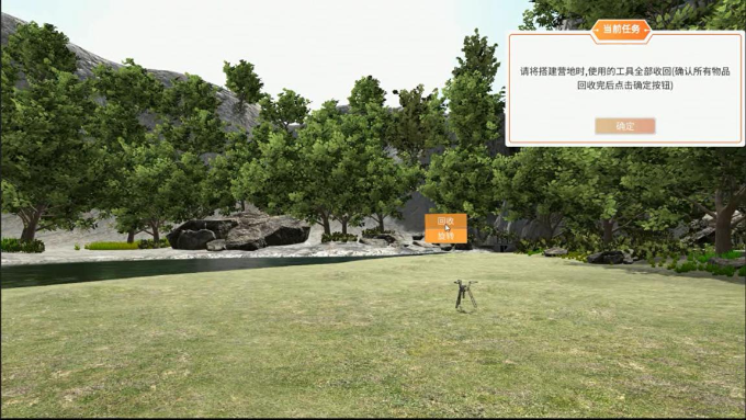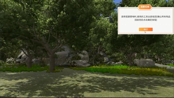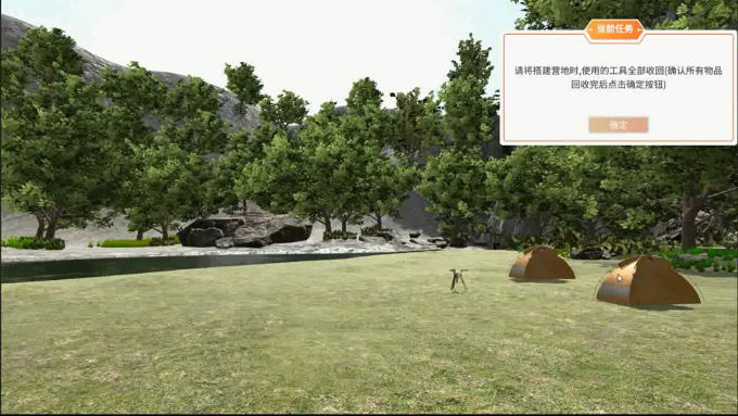 点击前进按钮,进入虚拟场景中,根据步骤提示,野营结束后,将物品全部回收;
