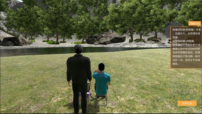 晒伤处理完成后,显示晒伤处理方法,用户观察完成后,点击任务完成按钮,进入下一模块进行学习;
