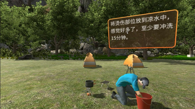 展示虚拟人物不小心被烫伤动画,用户根据步骤提示,学习烫伤的处理流程;