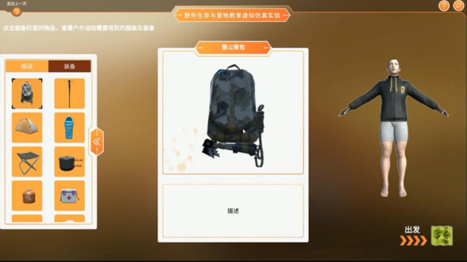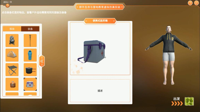 进入户外服装及准备学习模块:用户可点击装备栏中的物体,查看三维模型。学习完户外需要携带的服装和装备后,点击出发按钮,进入下一模块;