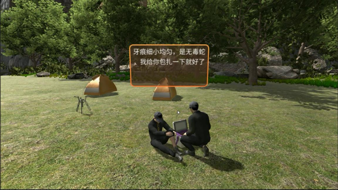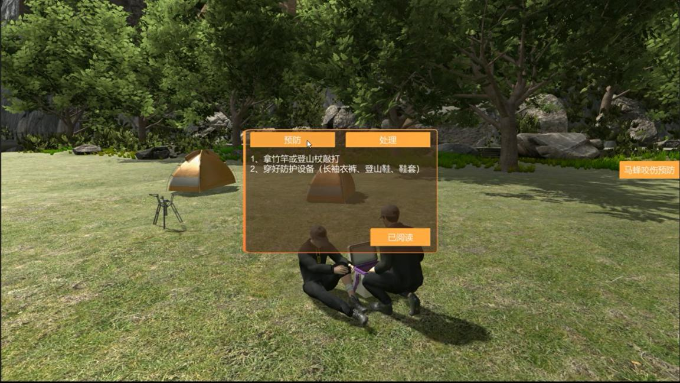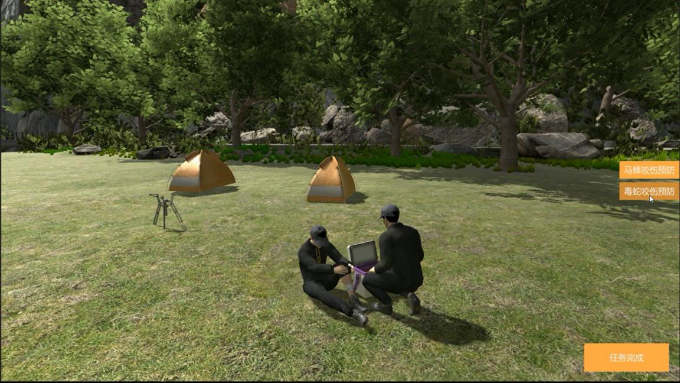 用户可在场景中查看马蜂咬伤和蛇咬伤的处理方式,也可点击任务完成按钮,学习下一模块;