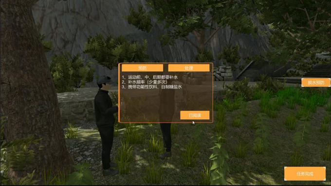 展示虚拟人物喝水动画,通过步骤提示学习如何预防中暑;