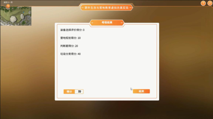 用户对垃圾进行分类选择,选择完成后,点击离开营地,查看考核结果;