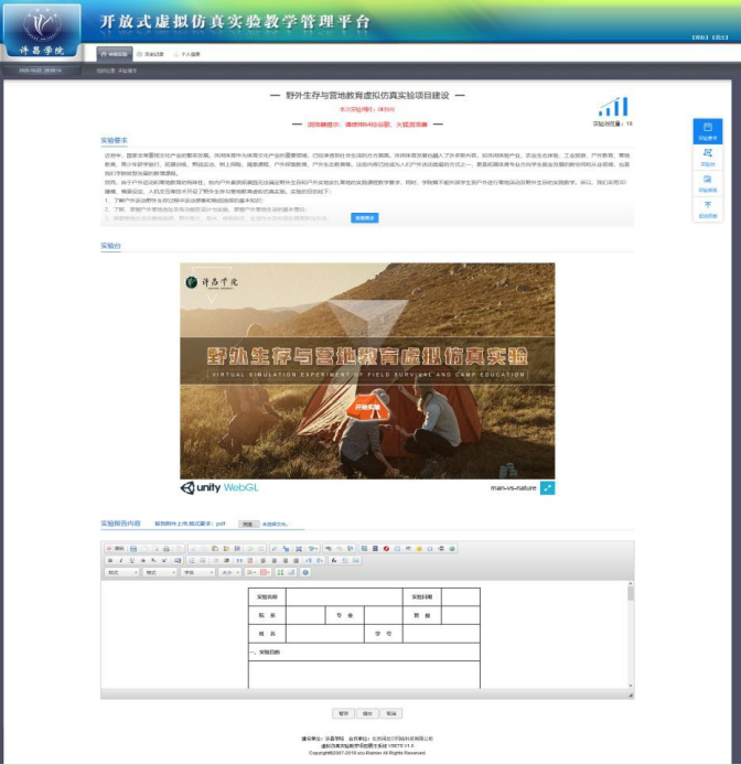 虚拟仿真实验是信息技术与实验教学的深度融合产物,极大地拓展了学生的学习资源和空间,特别适应现代教育的发展,丰富了学生的学习模式。项目采用虚实结合的方式进行实践教学。线上学生可以通过交互式互动进行户外实景的具体操作,突破了户外教学的场域限制,将校内实践场所不能进行的实践教学内容通过虚拟仿真的形式在线上呈现,学生可以使用动画的交互式互动完成野外生存过程中突发事件的处理步骤,充分发挥虚拟仿真技术在实践教学中的应用。