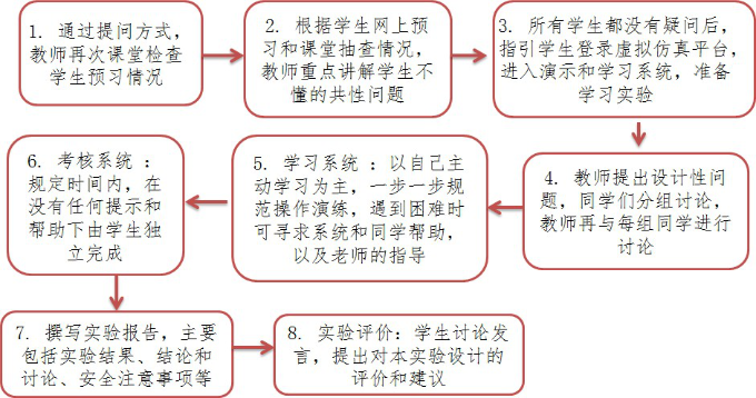 该教学方式充分利用了“虚拟仿真实验”的现代信息技术特点,可以实时培 训,避免人力财力的大量消耗,学生可以自由地在任何地方时时刻刻体验,不受时间和空间的限制,在教师的引导下,学生通过网络智能化地学习。学习过程如下: