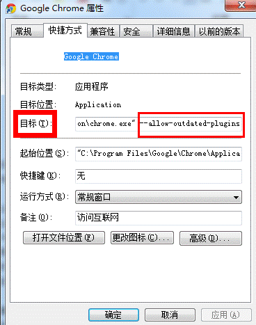 在目标 后面的地址栏中输入:--allow-outdated-plugins,然后确定。