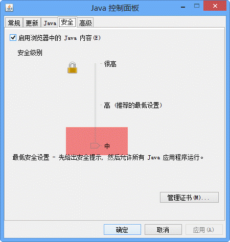 解决方法:进入控制面板——》程序——》Java——》安全,把安全等级也调到最低。如下图所示: