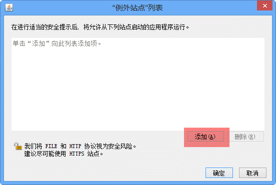 解决方法2:进入控制面板——》程序——》Java——》安全,在例外站点里把您访问的